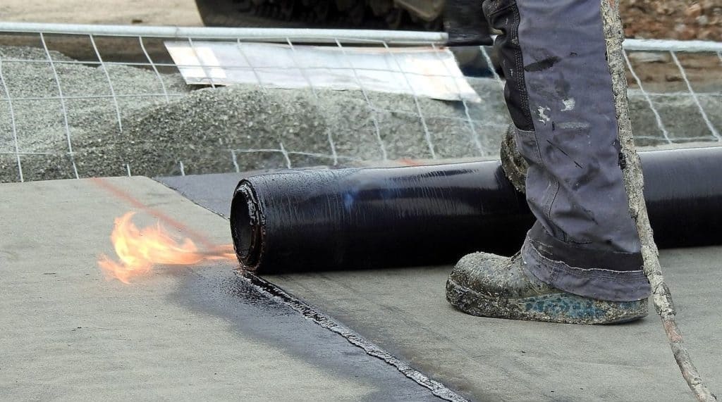 Applying a waterproof membrane using a torch to heat and fuse the material to the substrate.